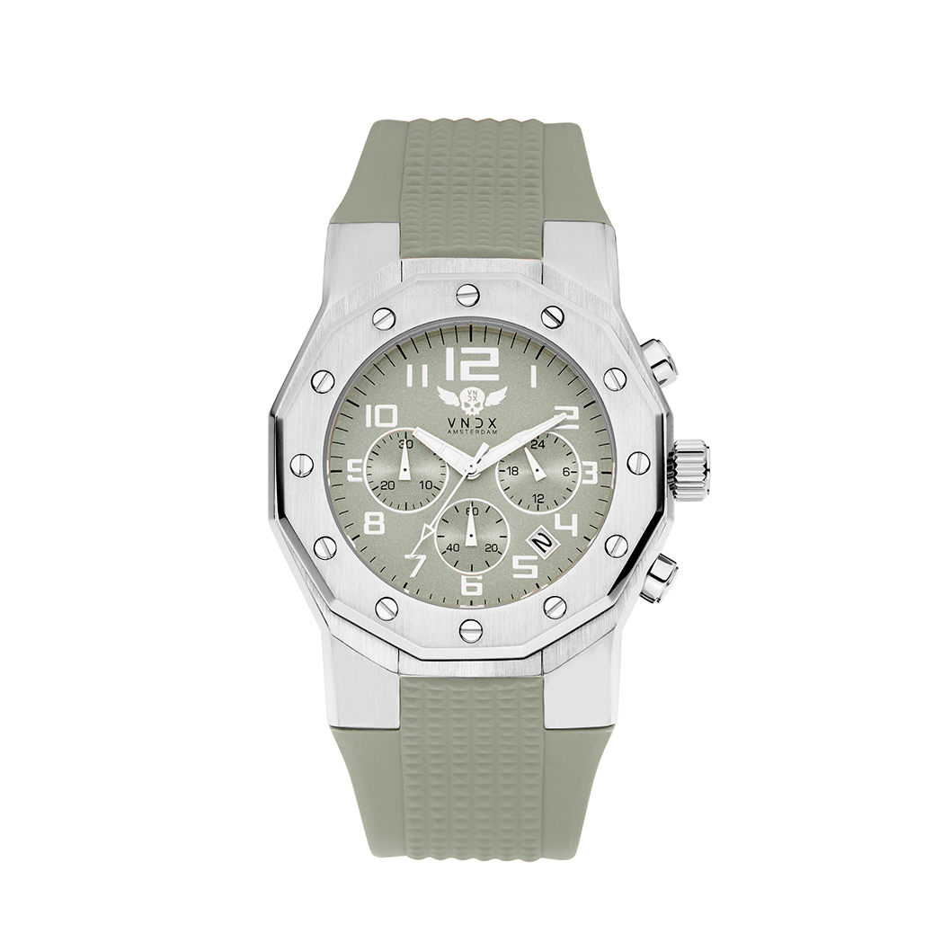 Een stoer horloge voor hem en haar, uitgevoerd met een mat geborstelde stalen kast, gecombineerd met de flexibele en comfortabele groene siliconen band.