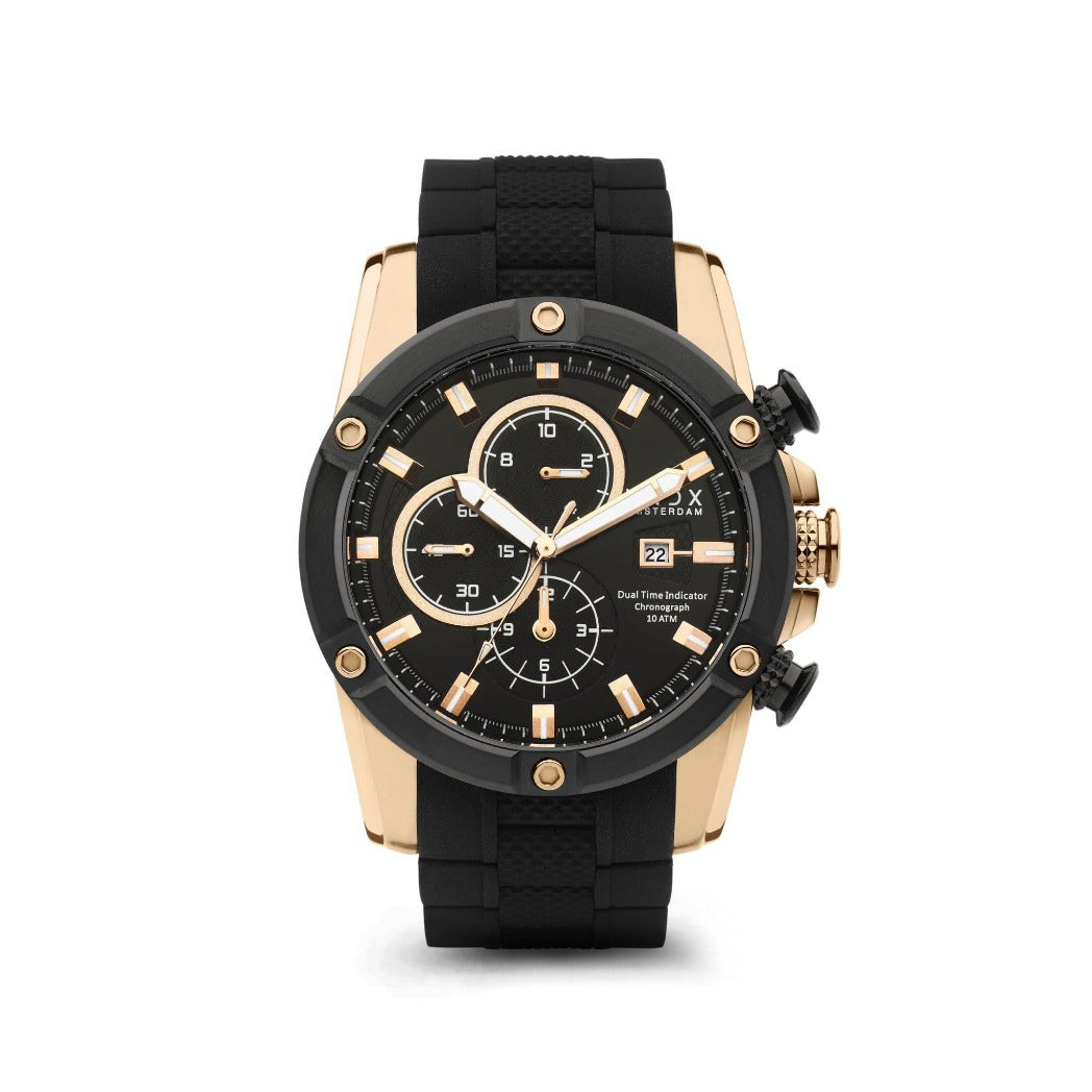 Zijn stijlvolle zwarte wijzerplaat bevat verschillende chronograaf functies, waaronder een stopwatch en een datum aanduiding. De massieve multifunctionele kast past perfect om de pols, door de stevige rubberen band is de band eenvoudig op maat te dragen.